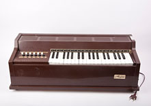 1 Klangfarbe bzw. Register und 2 Oktaven sowie ein Bassregister mit 6 Tönen. Circa 1970er Jahre.